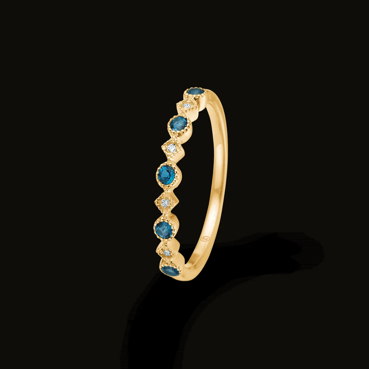 Ringen er en luksuriøs og fortryllende ring fremstillet i 14 karat guld, der kombinerer elegant design med ædelsten af højeste kvalitet. På oversiden pryder smukke blå topaser, der skaber et strålende fokuspunkt og giver ringen et sofistikeret udtryk. Mellem topasserne er der indfattet glitrende brillanter, der tilfører ekstra elegance og glans til ringen.