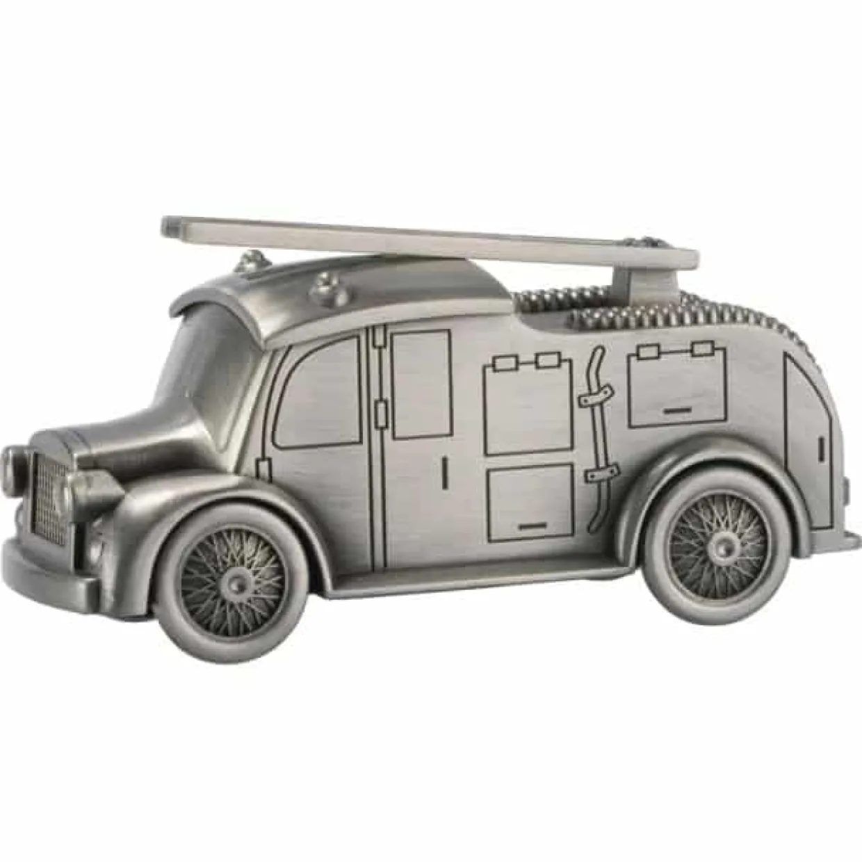 Rigtig fin fortinnet sparebøsse som er mat og fin i overfladen. Sparebøssen forestiller en brandbil med fine detaljer på. Sparebøssen måler 60 x 140 mm
