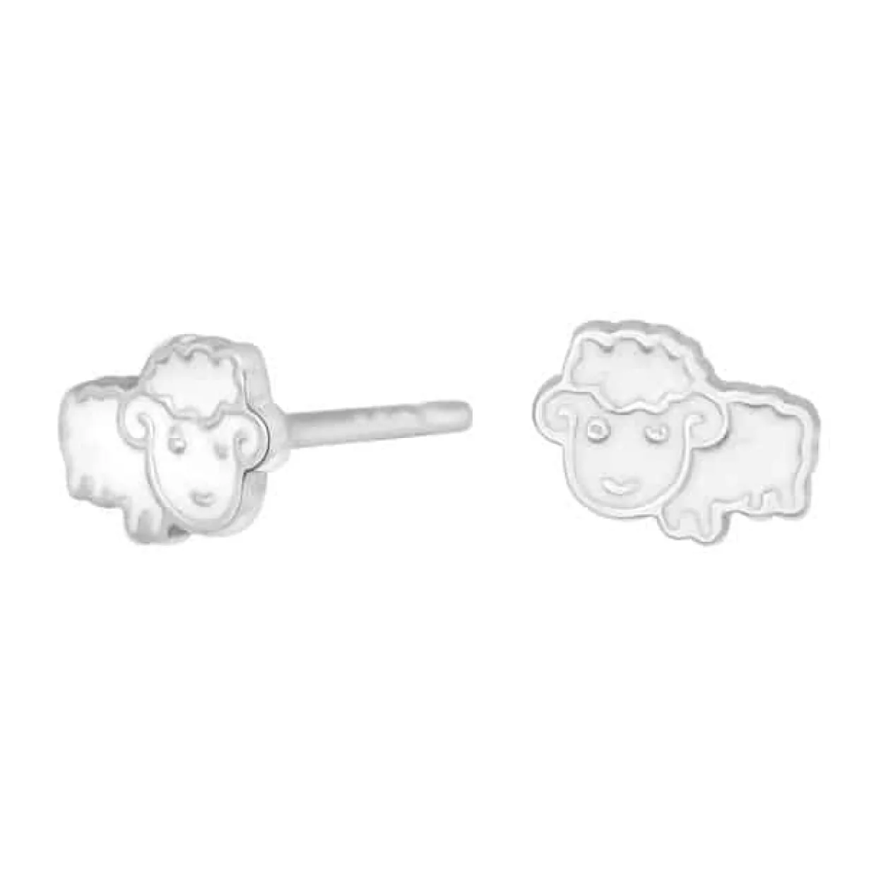 Sølv øreringe på stik med får. Fåret er med blank hvid oveflade. Øreringene måler 5,4 mm i højden og 7,6 mm bredden. Øreringene er rhodineret.