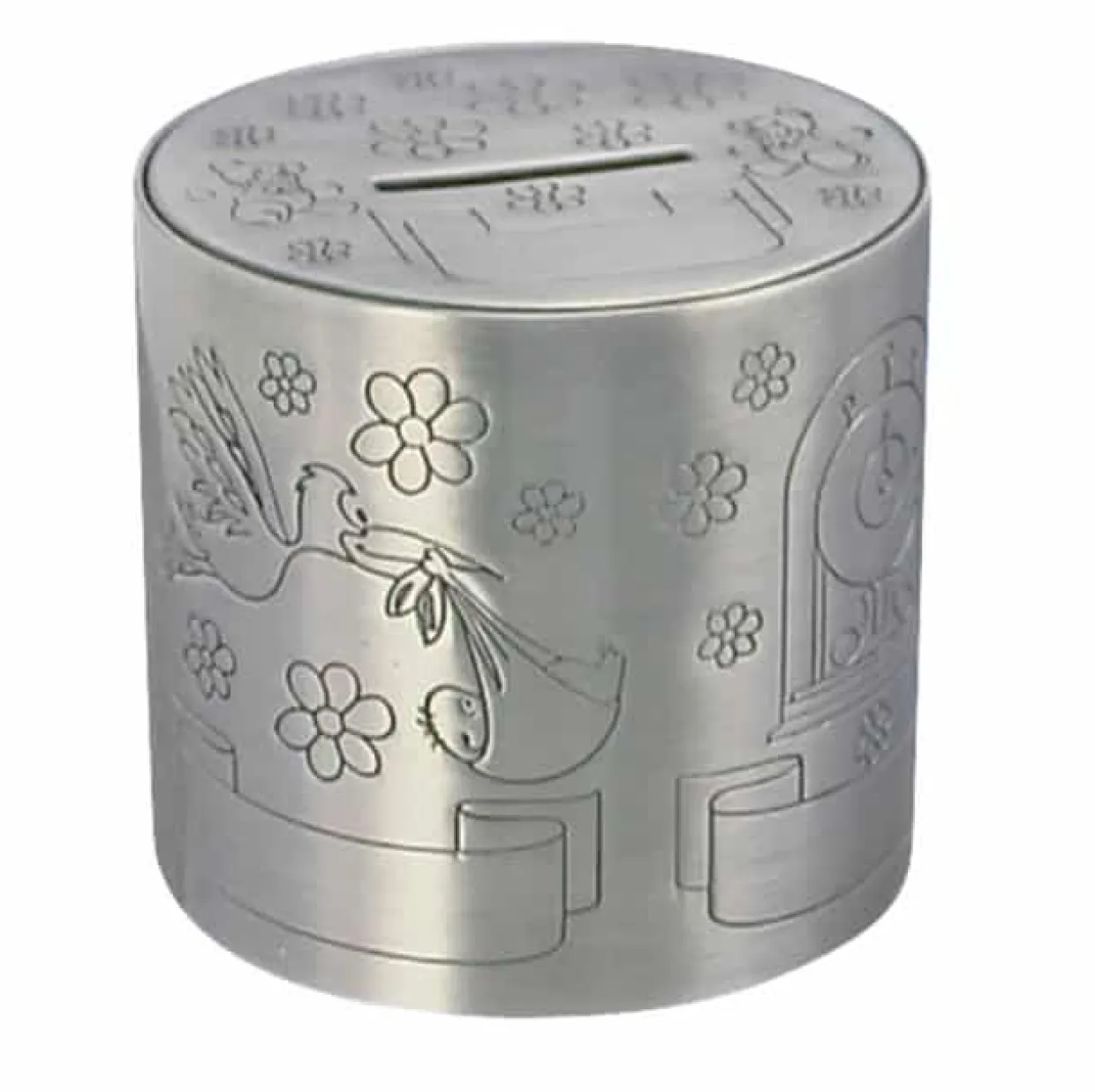NOA KIDS sparebøsse i fortinnet finish – et ideelt minde til dåben eller som en særlig gave til den nyfødte. Sparebøssen er udsmykket med klassiske dåbsmotiver, der emmer af kærlighed, tradition og barnlig glæde.