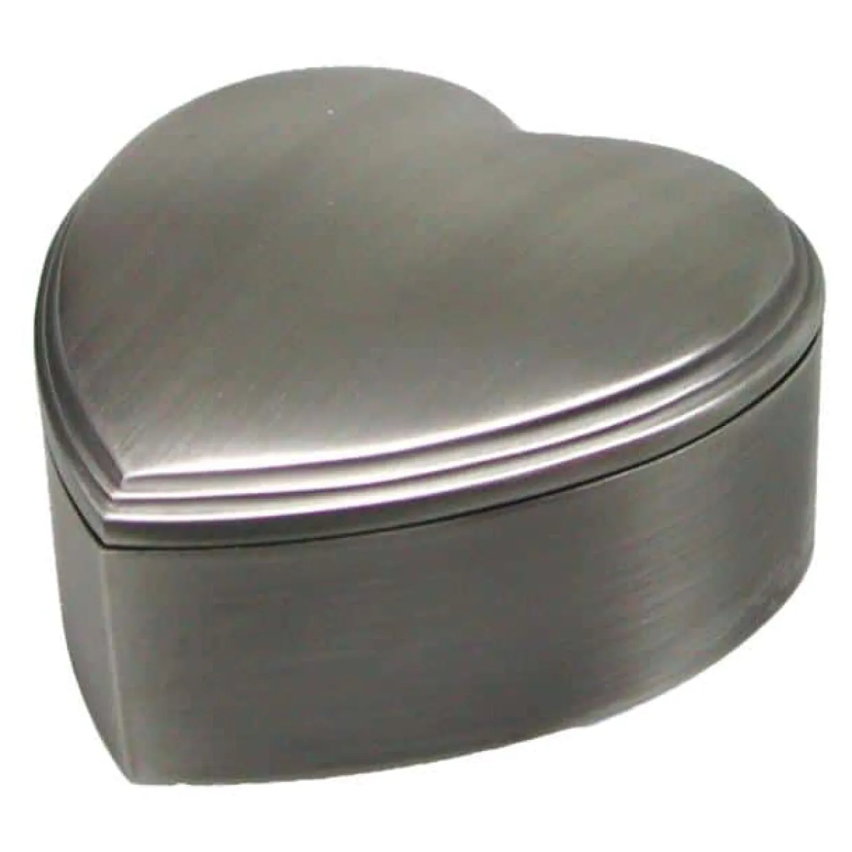 Fortinnet smykkeskrin i 8X8 i form af hjerte med mørkerødt foer, findes også i blank og i 2 andre størrelser 10X10 og 12X12 mm.