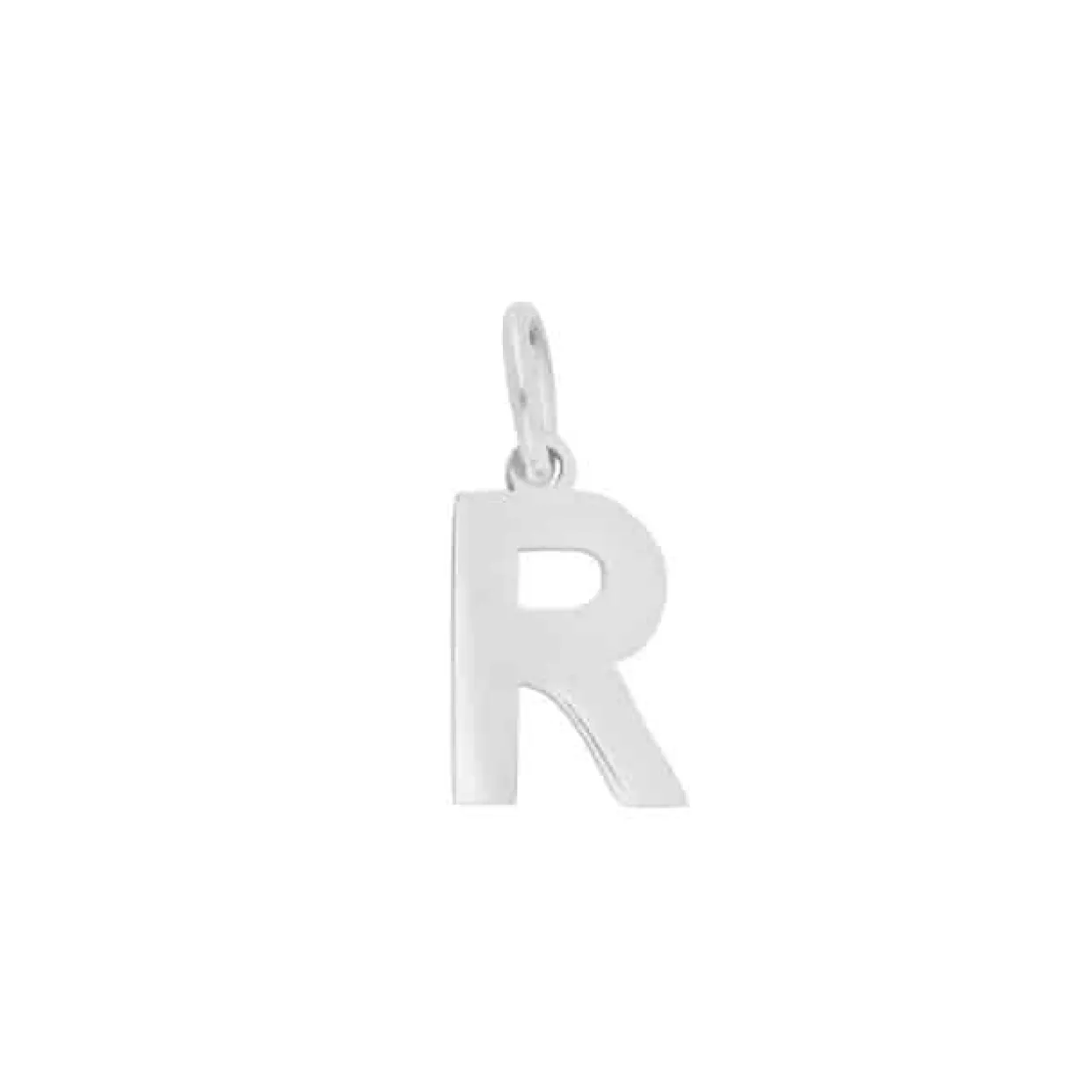 Enkelt og tydeligt bogstavs vedhæng, med bogstavet R. Vedhænget måler 9 mm i højden og 6 mm i breden. Vedhænget er lavet ud af sterling sølv.