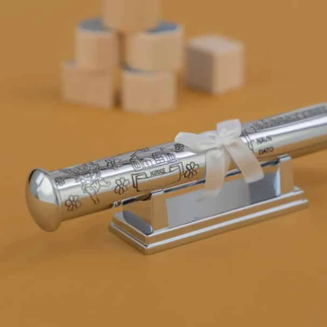 Fortinnet dåbsrør med fod. I dåbsrører kan man opbevarer sin dåbsattest og der kan også graveres på selv dåbsrøret. Dåbsrøret har en længde på 24 cm og en bredde på 3,5 cm.