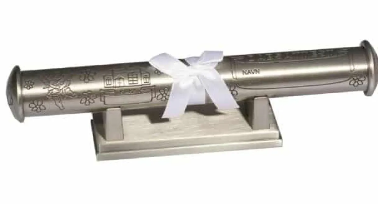 Fortinnet dåbsrør med fod. I dåbsrører kan man opbevarer sin dåbsattest og der kan også graveres på selv dåbsrøret. Dåbsrøret har en længde på 24 cm og en bredde på 3,5 cm.