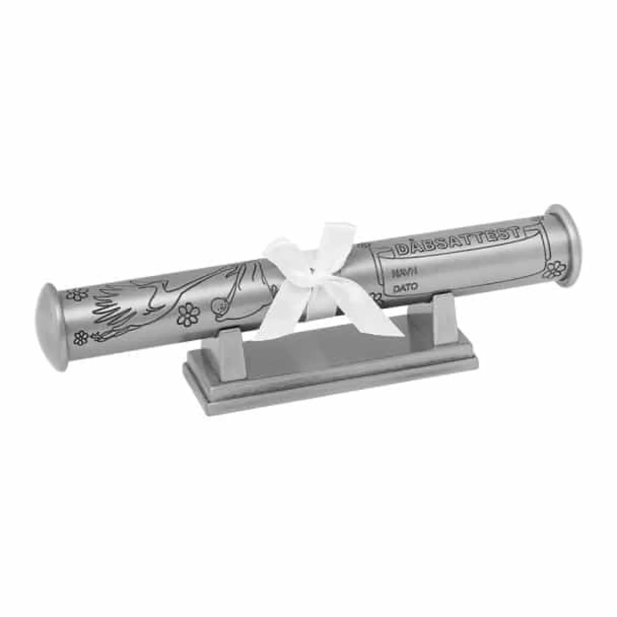 Fortinnet dåbsrør med fod. Dåbsrøret er beregnet til at opbevarer sin dåbsattest i så den ikke bliver væk eller går i stykker. Dåbsrøret har en længde på 24 cm og en bredde på 3,5 cm.