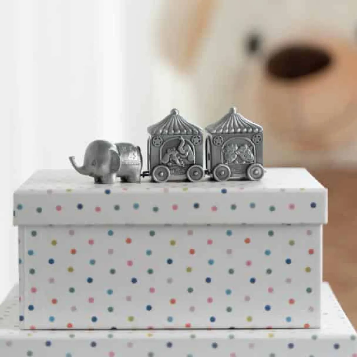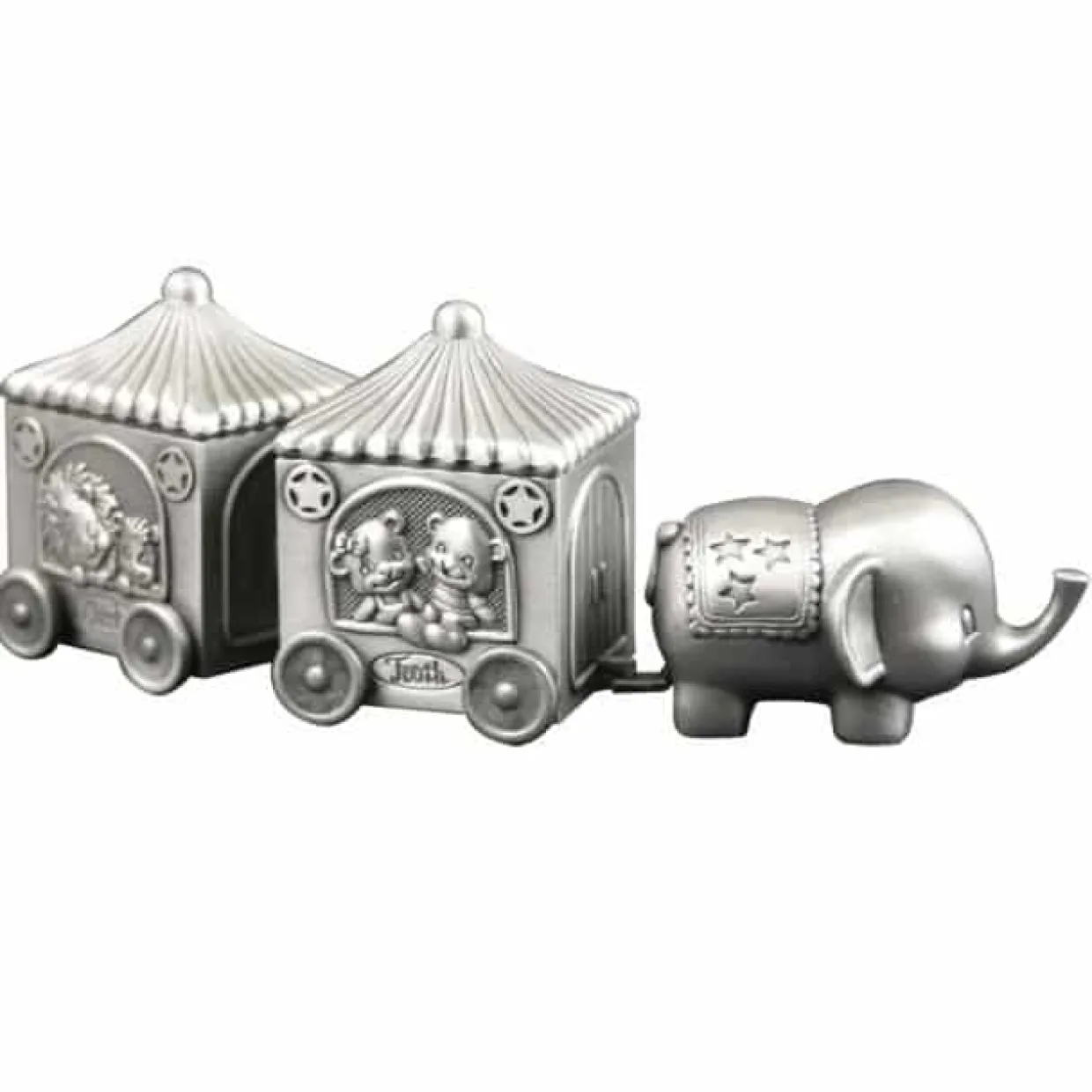 Fortinnet første tand og hårlok. Tand og hårlok toget måler 14 cm i længden og 5 cm i bredden. Vognene sidder løst på elefanten.