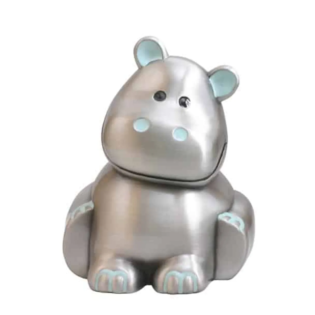 Fortinnet sparebøsse med flodhest. Flodhesten er med blå øre, næse og tæer. Flodhesten måler 12,5 cm i højden og 8,5 cm i bredden.
