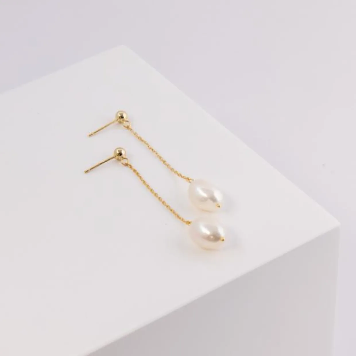 Sølv forgyldt øreringe som hænger med ferskvandsperle. Ørehængerne har en længde på 60 mm. Perlen som er en barok ferskvandsperle måler 10 mm i diameter.