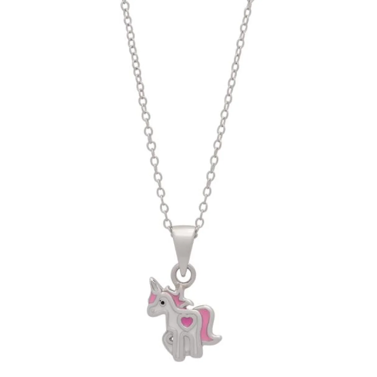 Sølv børne halskæde med enhjørning. Vedhænget måler 10,65 mm i højden og 7,75 mm i bredden. Kæden er 38 cm som er en fin længde kæde.