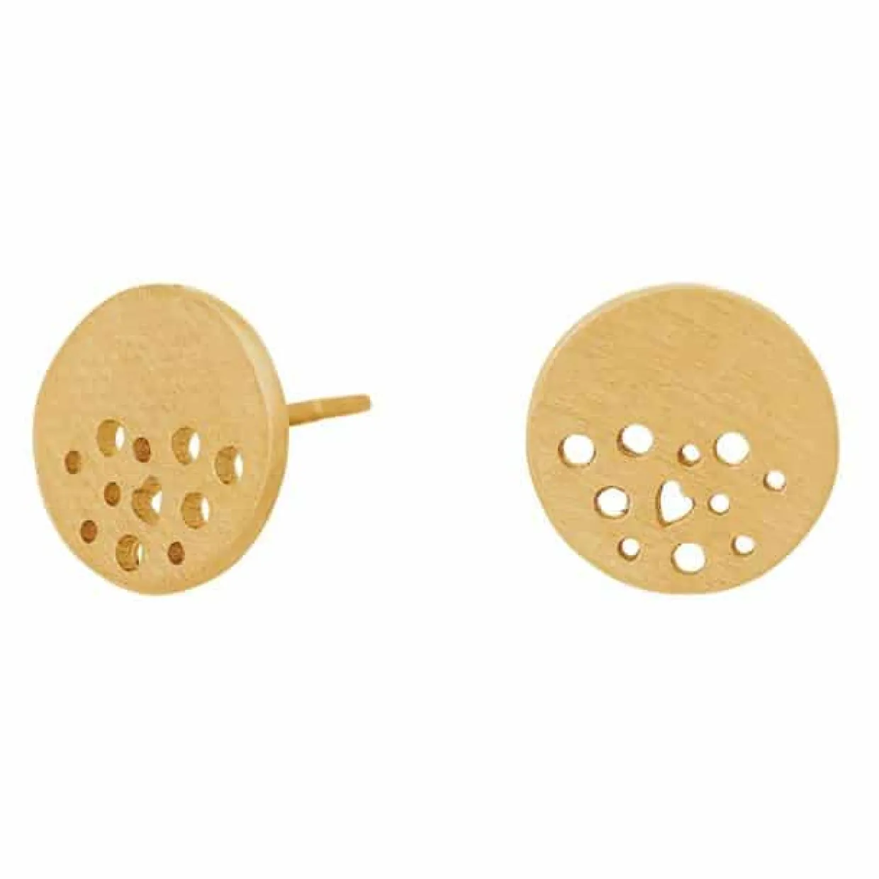 Sølv forgyldt øreringe rund plade med huller. pladen har en mat overflade og måler 10 mm i diameter. øreringene er uden sten.