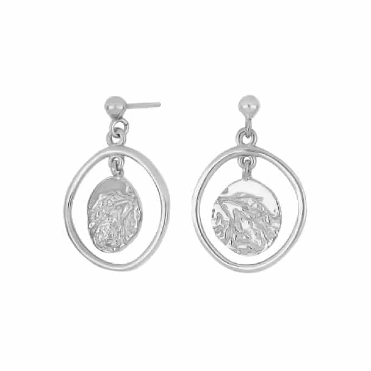 Søde øreringe i rhodineret sterling sølv. Øreringen er designet som ørestikker, med en løs plade med en hamret overflade som hænger ned fra øreflippen.