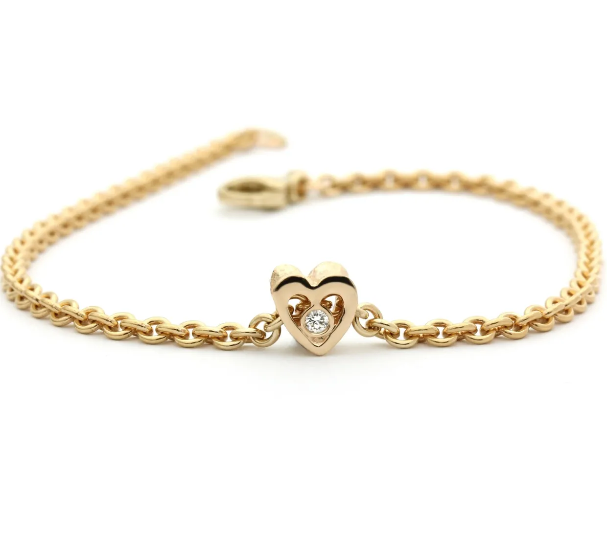 14 karat guld armbånd hjerte med brillant. Brillanterne har en samlet carat på 0,04 carat i kvaliteten top wesselton/vs. Armbåndet kan laves i alle længder.