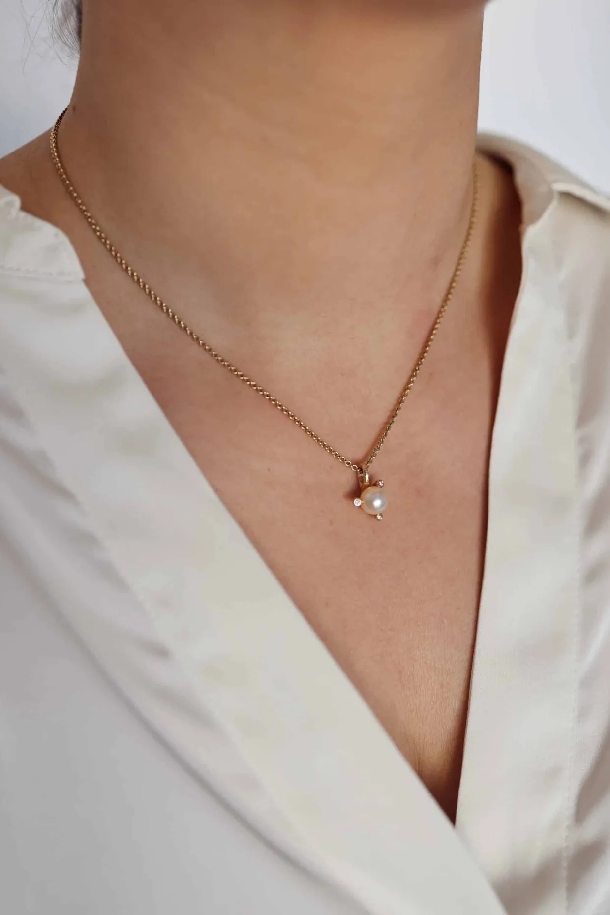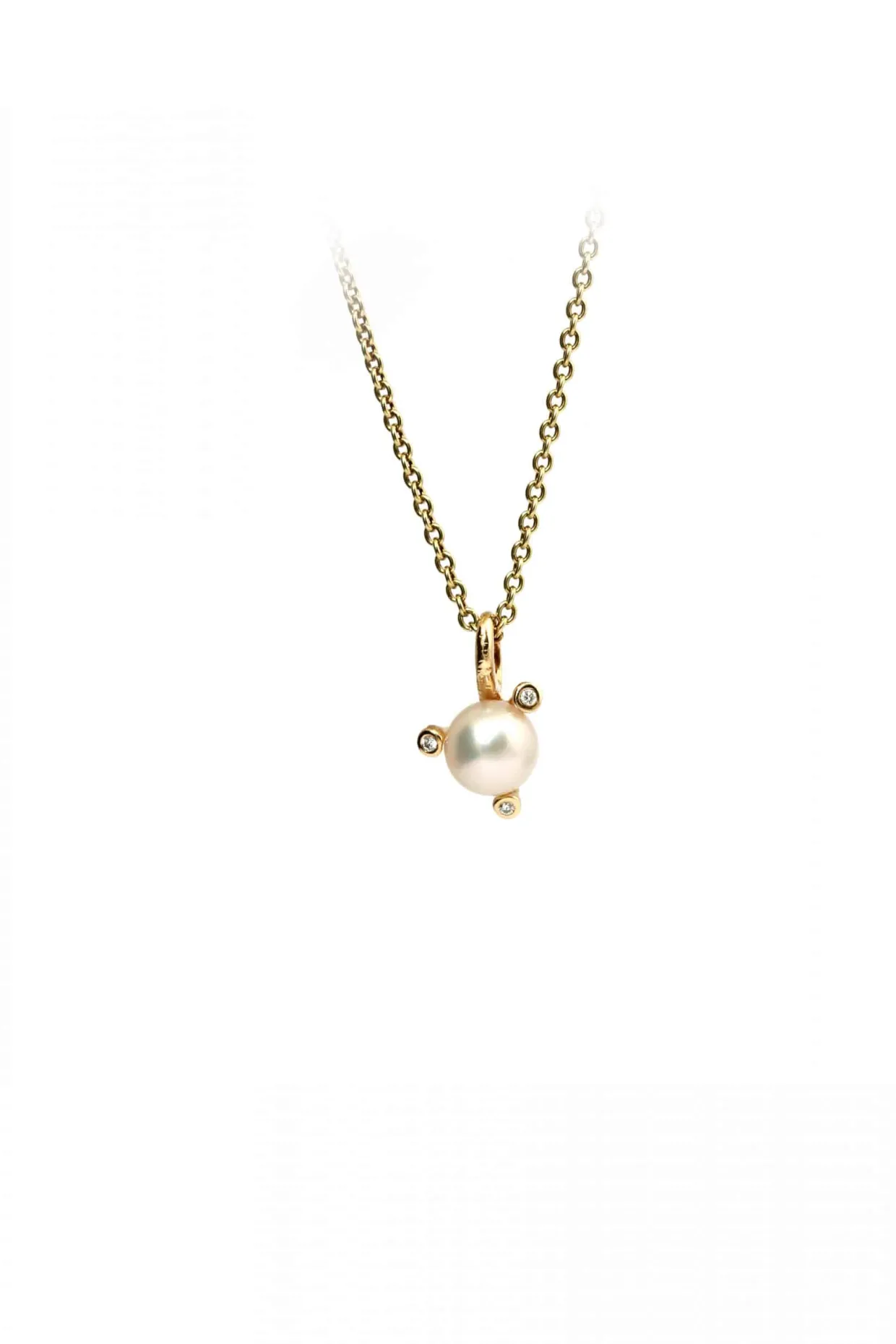 14 karat guld vedhæng med hvid ferskvands kultur perle. Perlen bliver holdt med tre grabber, hvor ude på enderne sidder en brillant. Brillanterne er på i alt 0,03 carat i kvaliteten top wesselton/vs. Kæden medfølger som er en sølv forgyldt rund anker kæde i 45 cm. Kæden kan om byttes efterfølgende.