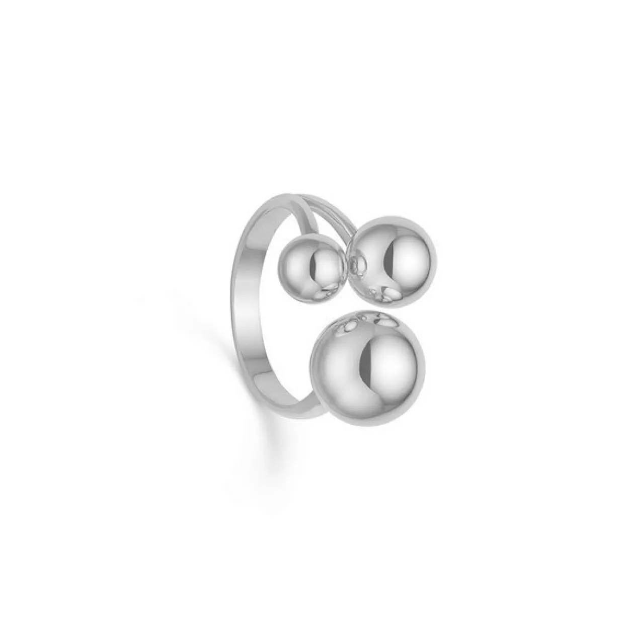 Kugle ring lavet i sterlingsølv med tre kugler i forskellige størrelser. Ringen er lavet af Randers Sølv og er en del af en serie med kugler i forskellige størrelser og konstellationer.