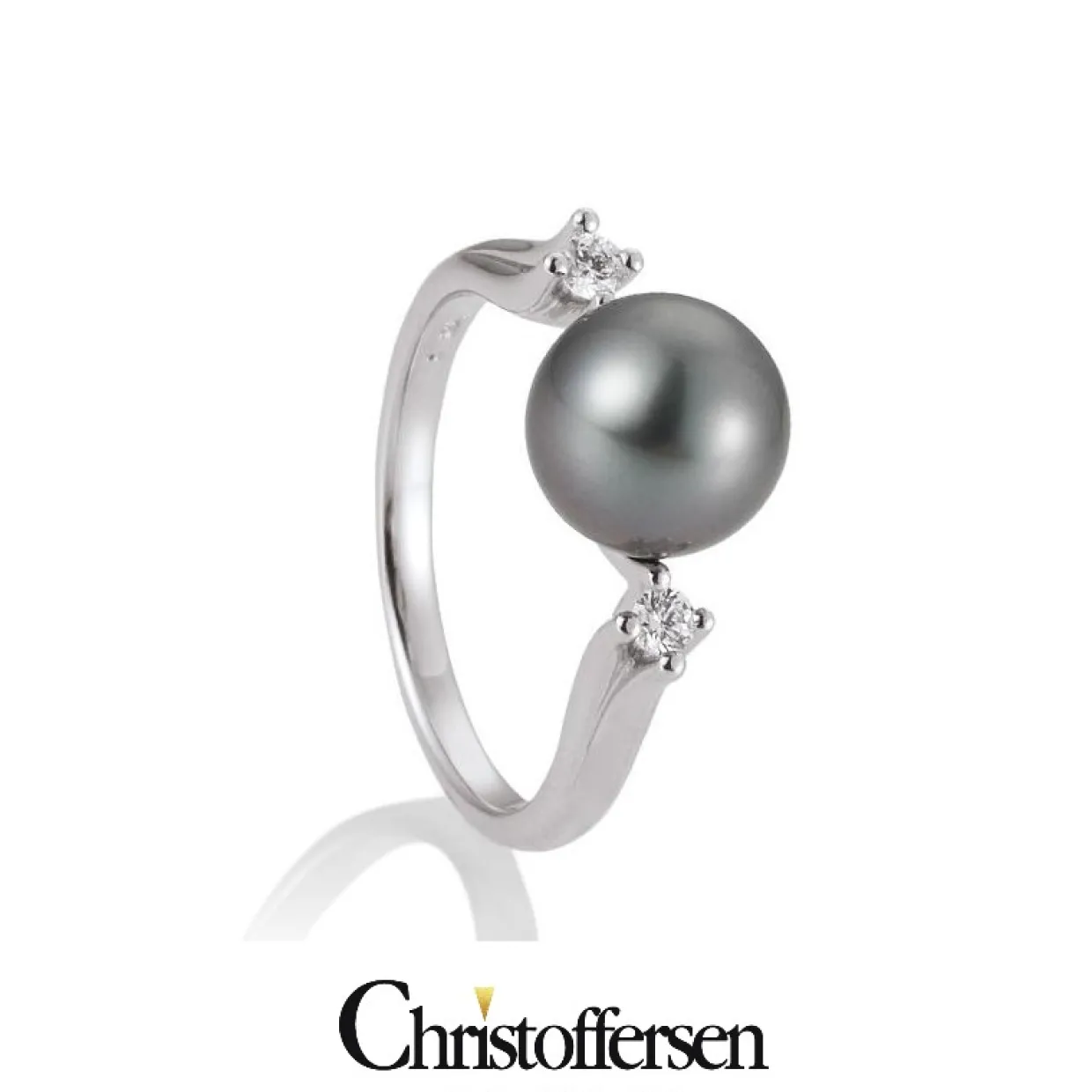 14 karat guld hvidguld ring med tahiti perle og to brillanter på i alt 0,10 carat i kvaliteten wesselton/si. Ringen er lavet i massiv 14 karat hvidguld og den mørke tahiti perle gør ringen utrolig unik.