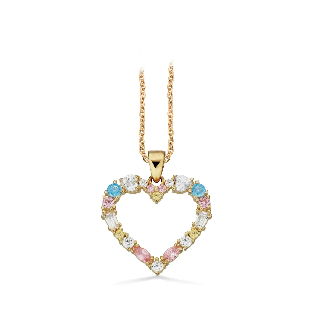 Romantisk 8 karat hjertevedhæng i pastel farver. Den tilhørende kæde er en forgyldt sterling sølv kæde i 45 cm. Stenene i vedhænget er syntetisk zirkoner i forskellige farver. Perfekt til de feminine kvinder og piger.