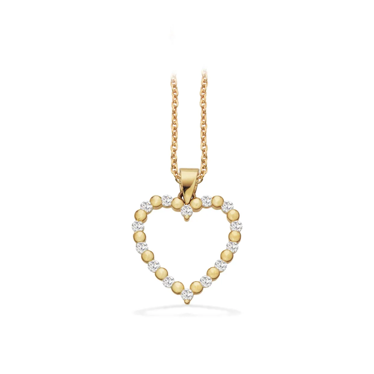 Romantisk og elegant hjerte vedhæng af 8 karat guld med syntetiske zirkoner, der holdes af fine små flade øer. Et smykke til den du holder af.