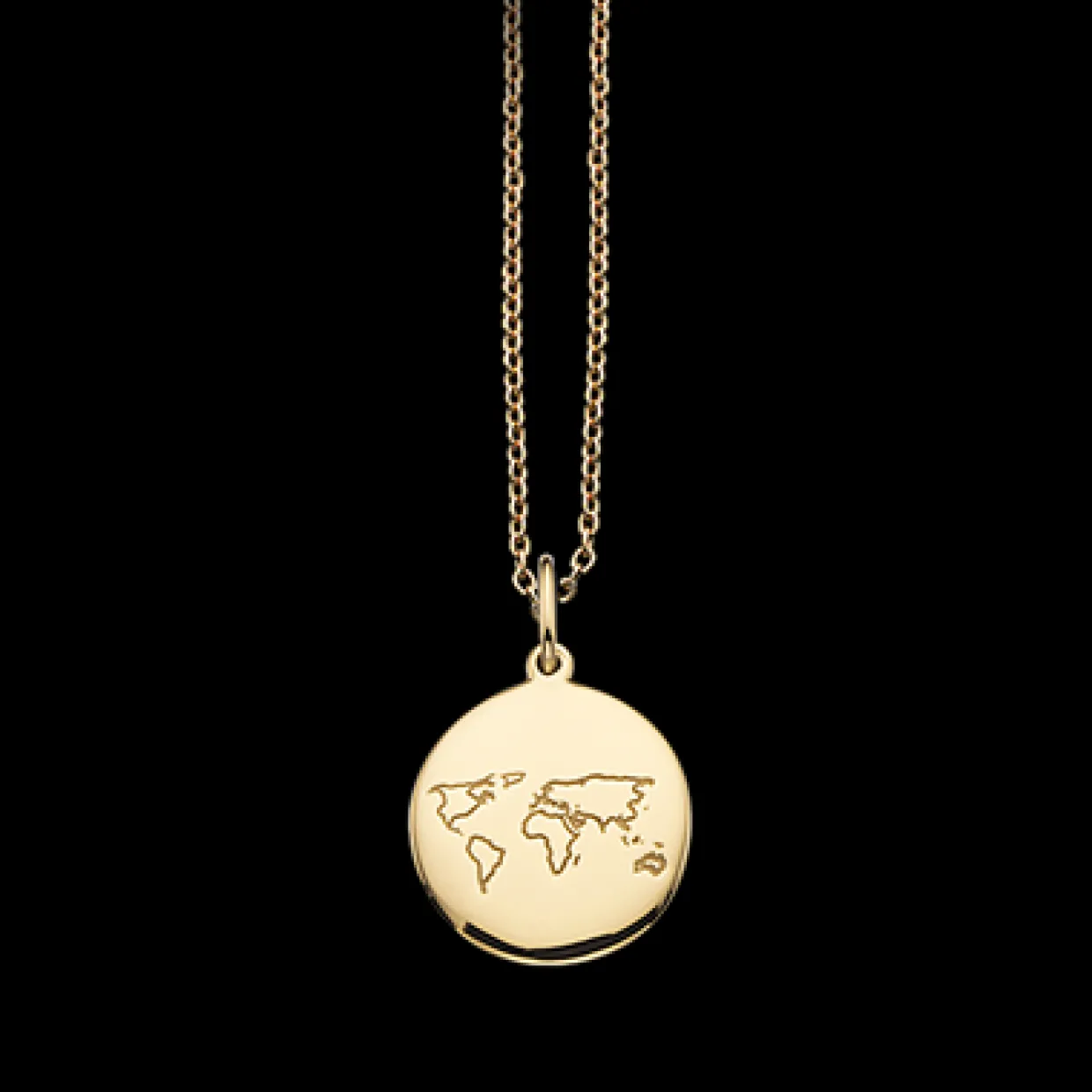 8 karat guld vedhæng som amulet med verdenskortet. Vedhæng er med sølv forgyldt rund anker kæde i 45 cm. vedhænget er cirkel rundt og findes også i andre udgaver.