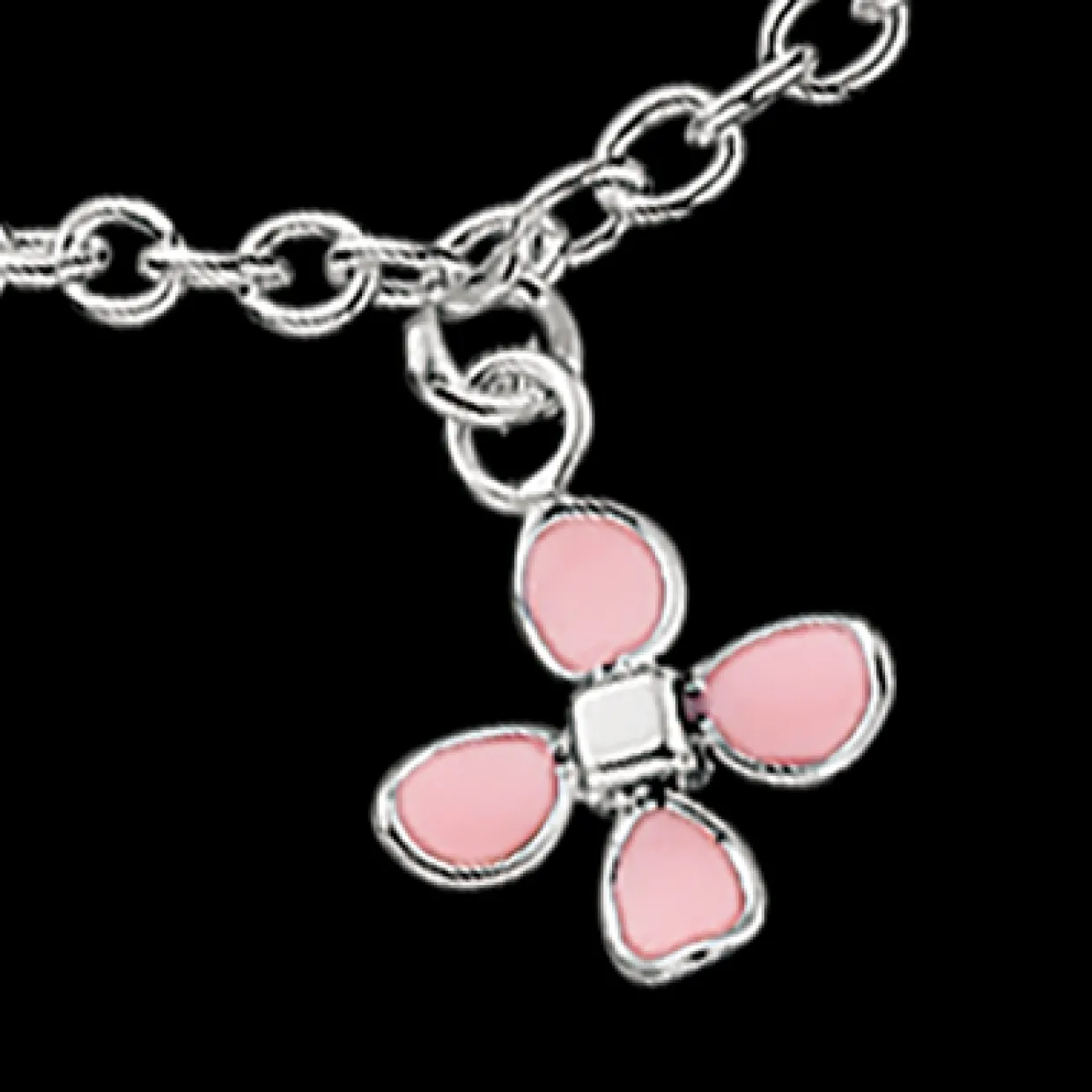Sølv børne armbånd med lyserød blomst. Armbåndet er 14+2 cm, så det kan passe til næsten alle børne håndled. Til armbåndet findes der også en halskæde.