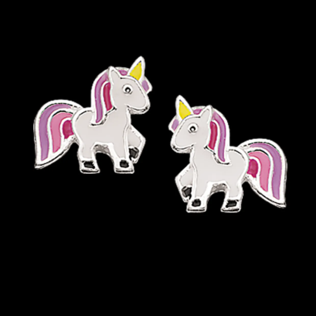 Øreringene med de fine enhjørninger er fremstillet i rhodineret sterlingsølv med farvet emalje.