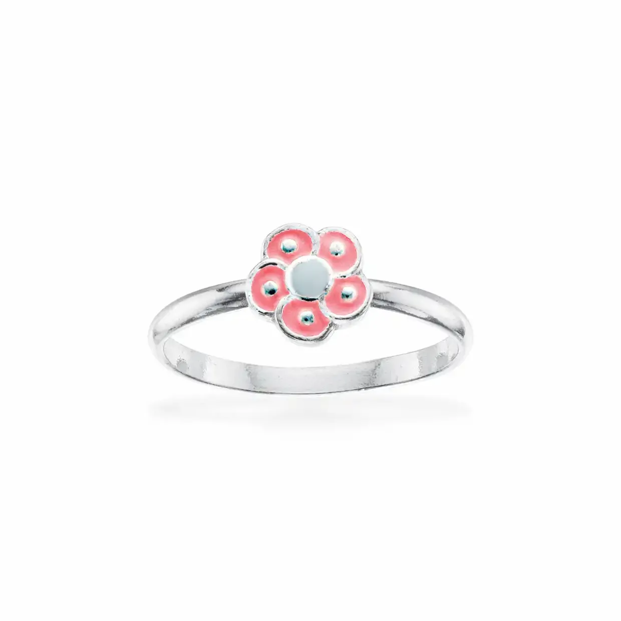 Sød børne ring lavet i 925 sterling sølv, designet med en lyserød blomst.