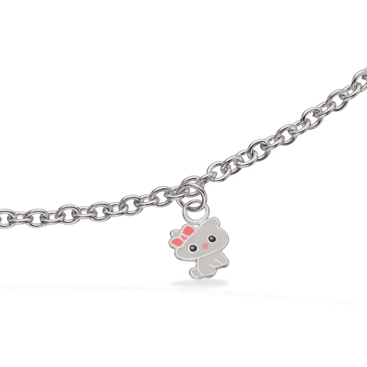 Børne armbånd i sølv med vedhæng, der forestiller en kat. Armbåndet er rund anker mønster. Vedhænget, katten, er belagt med emalje, der giver de flotte farver og detaljer.