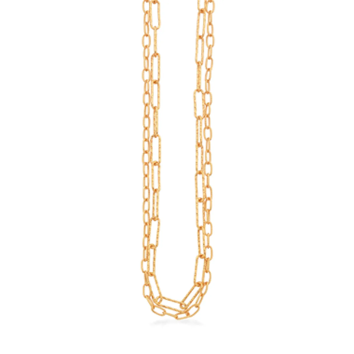 Smart dobbelt halskæde med en samlet lås, fremstillet i guldbelagt sterling sølv som har banket struktur i overfladen. Halskæden måler 42+5 cm i længden og er god hvis du kan lide at stacke dine smykker.