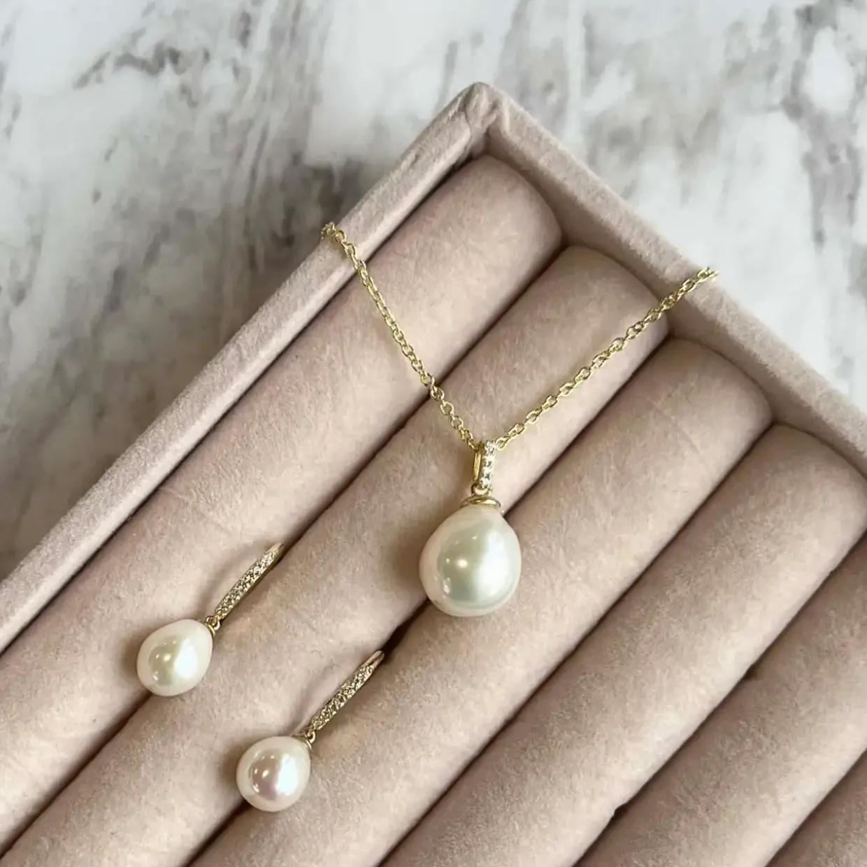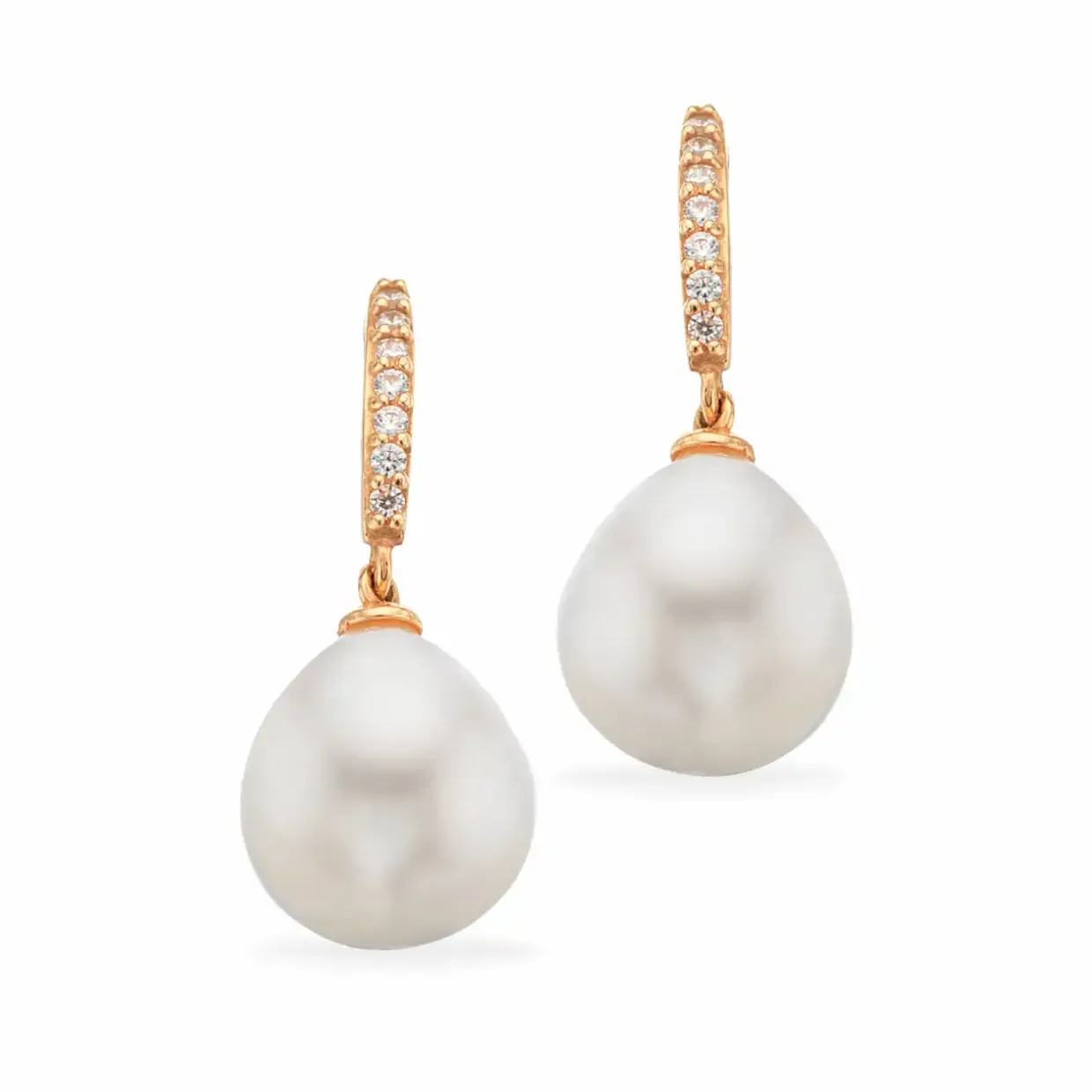 Fine øreringe med barok ferskvandsperle og små zirkonia isat. Der findes matchende halskæde.