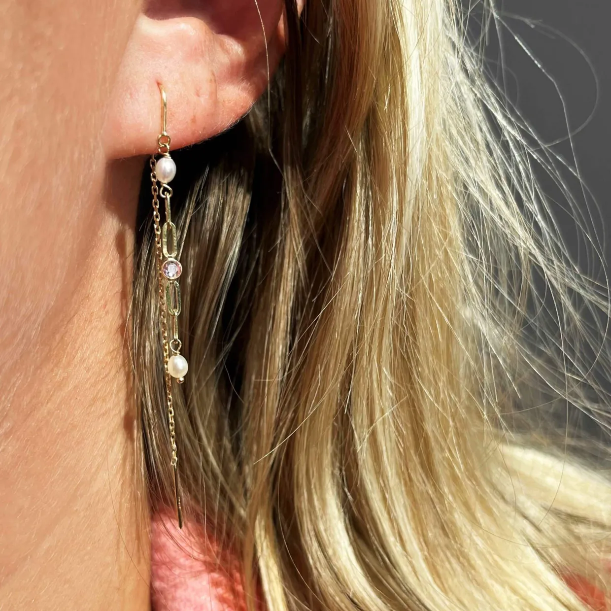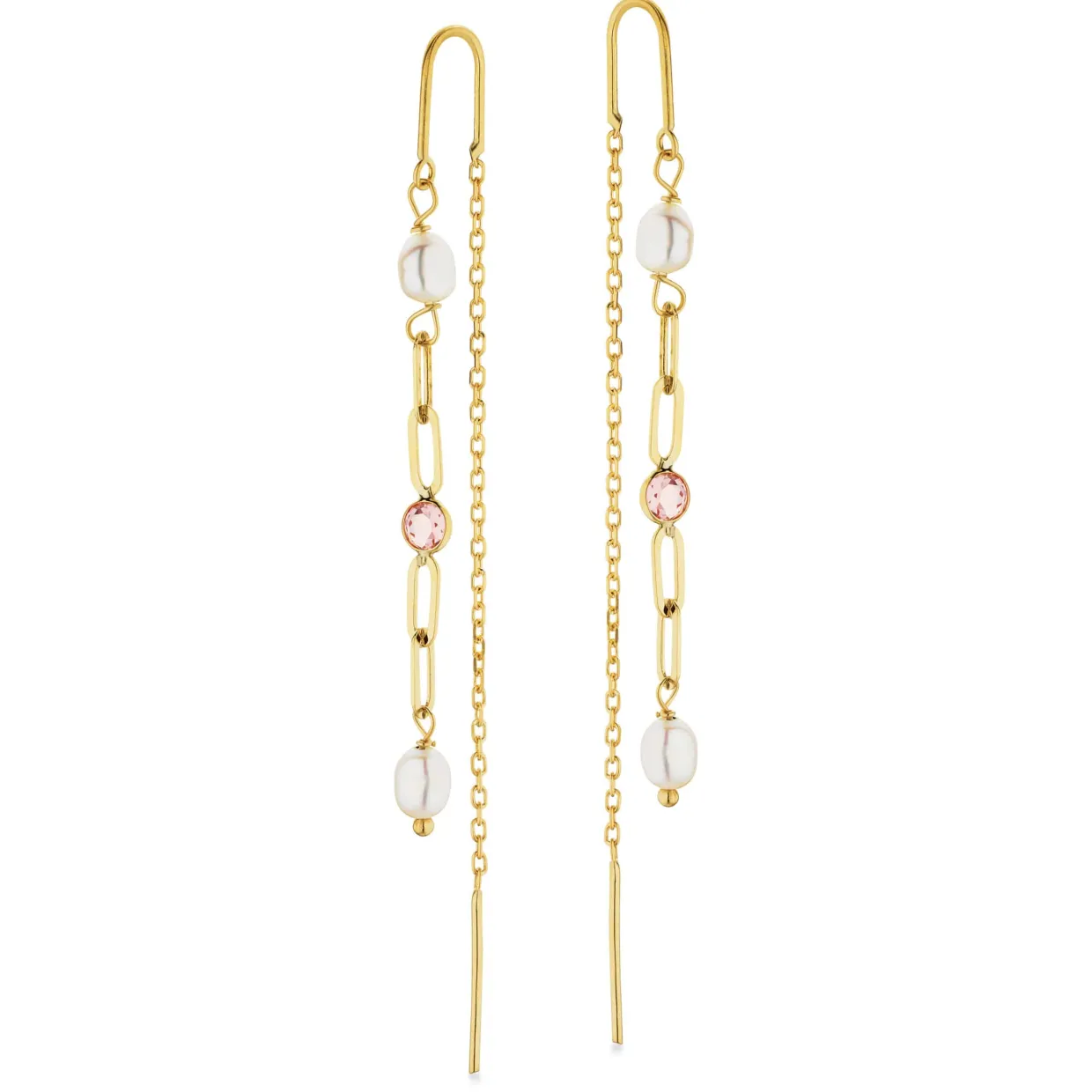 Øreringene er lavet i 9 karat guld med ferskvands kultur perle og rosa farvet syntetiske zirkonia.