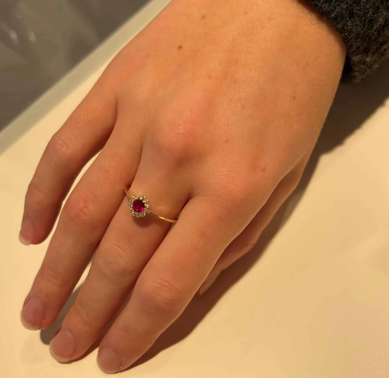 Smuk ring i 8 karat med en roset af rød zirkonia omgivet af klare zirkonia.