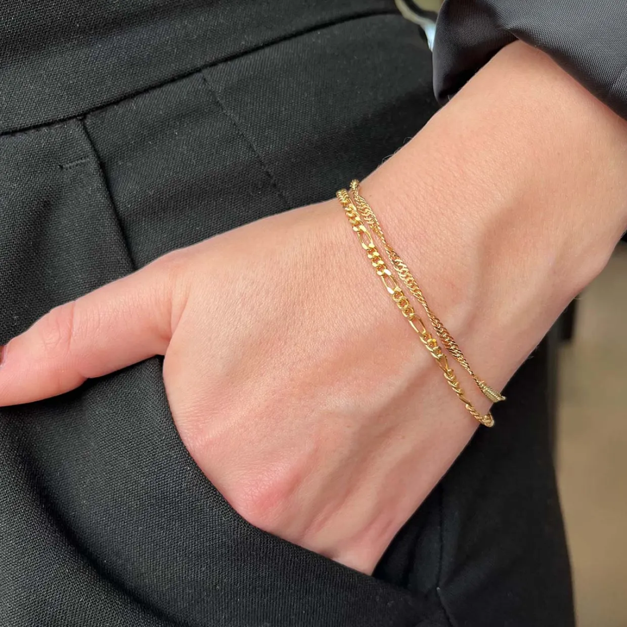 Sølv forgyldt armbånd i mønsteret singapore. Mønsteret er et snoet mønster de giver et spil spil på håndleddet. Armbåndet er 17,5 cm og kan forlænges med 1,5 cm.