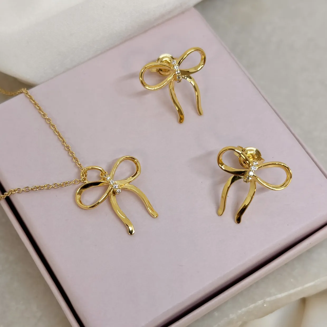 Øreringene er udført i forgyldt sølv, som giver en varm og luksuriøs glød. Den fine sløjfe symboliserer elegance, kærlighed og omtanke, mens de funklende zirkonia-sten tilfører et diskret, men iøjnefaldende spil af lys. Resultatet er et smykke, der både kan bæres til hverdag og løfte dit festlook med stil.