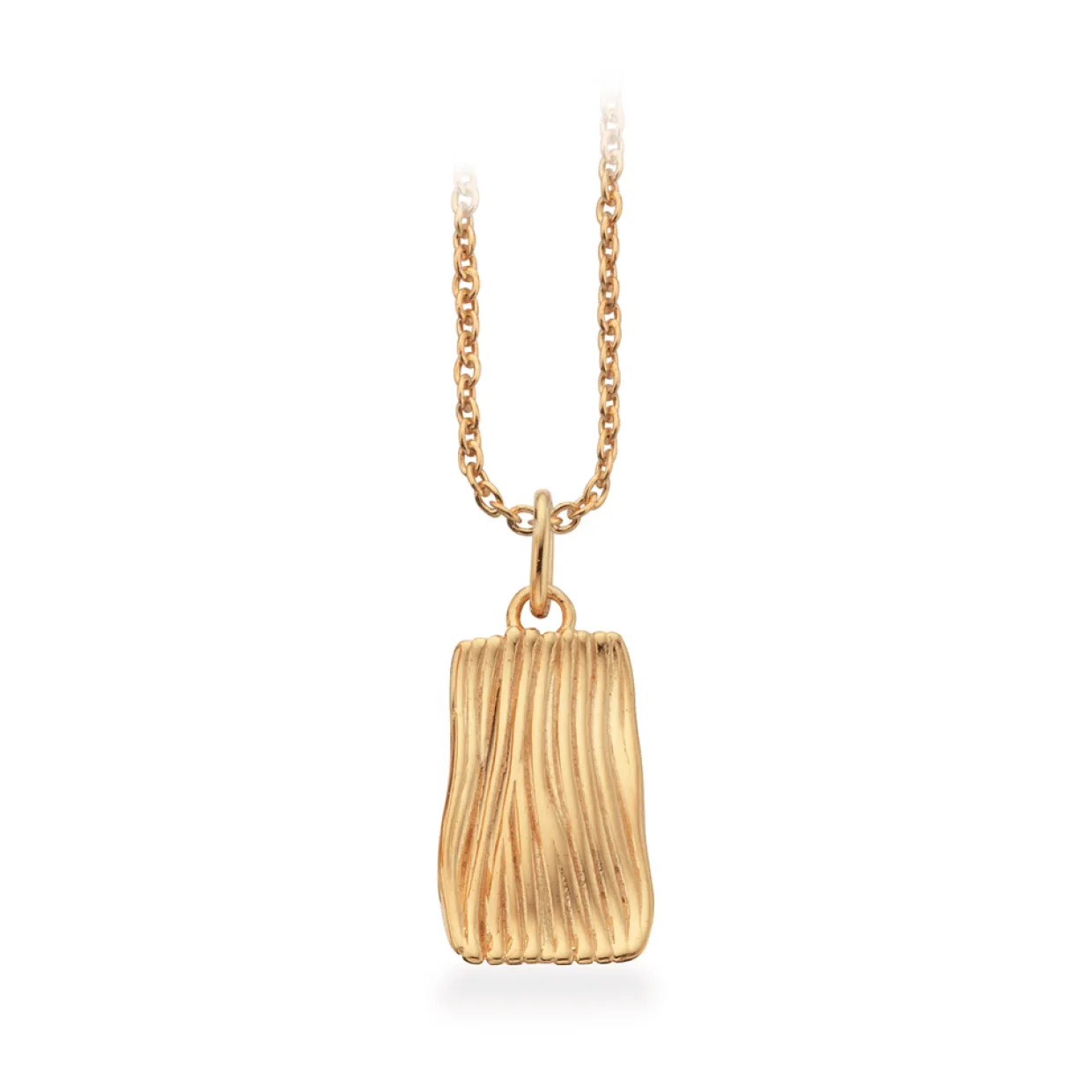 Sølv forgyldt halskæde med firkantet plade vedhæng. På plade vedhænget er der struktureret overflade. Til halskæden findes der også både øreringe og ring.