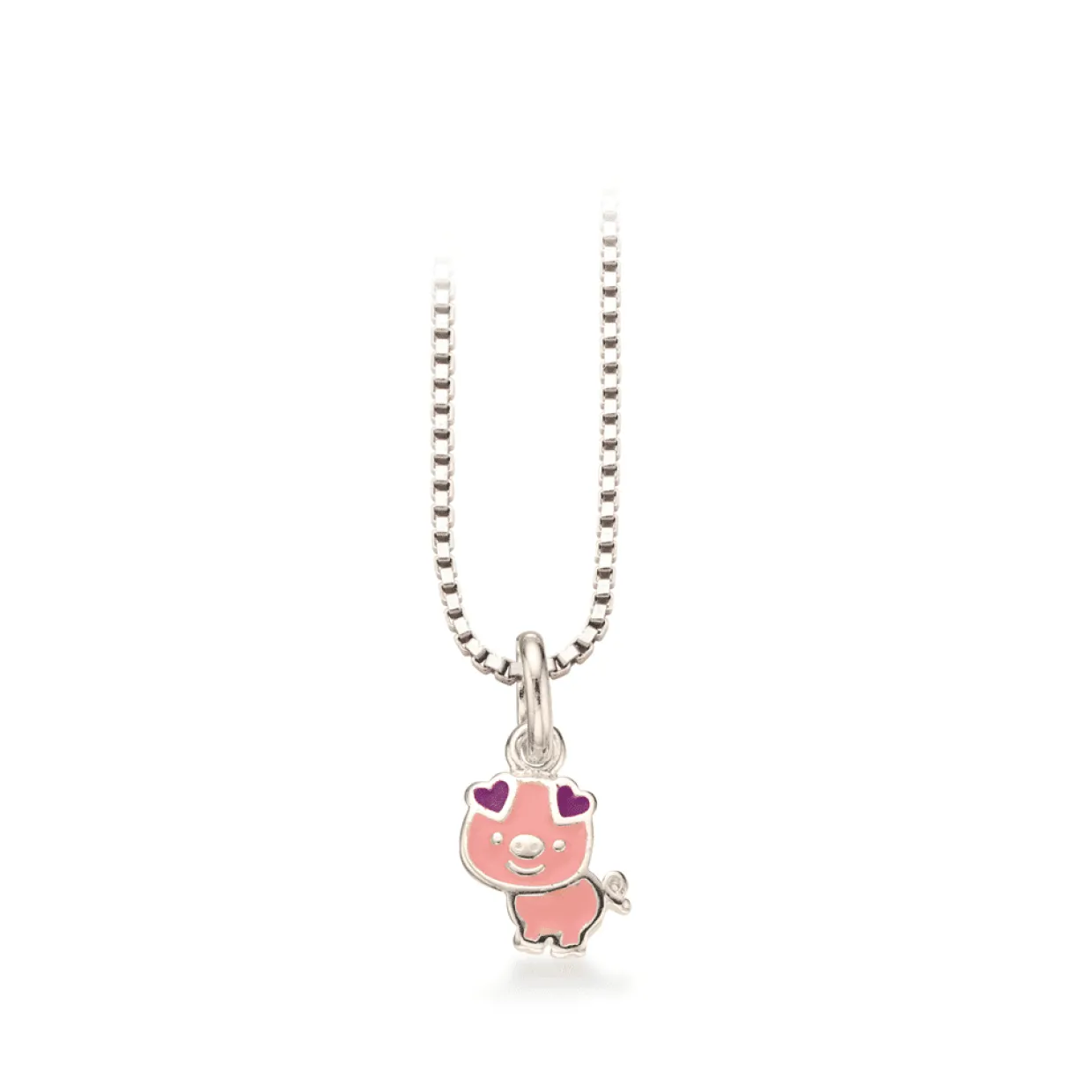 Sølv børne halskæde med med en lyserød gris. Kæden er en venezia kæde, som er finkantet. Til halskæden findes der både øreringe og armbånd til.