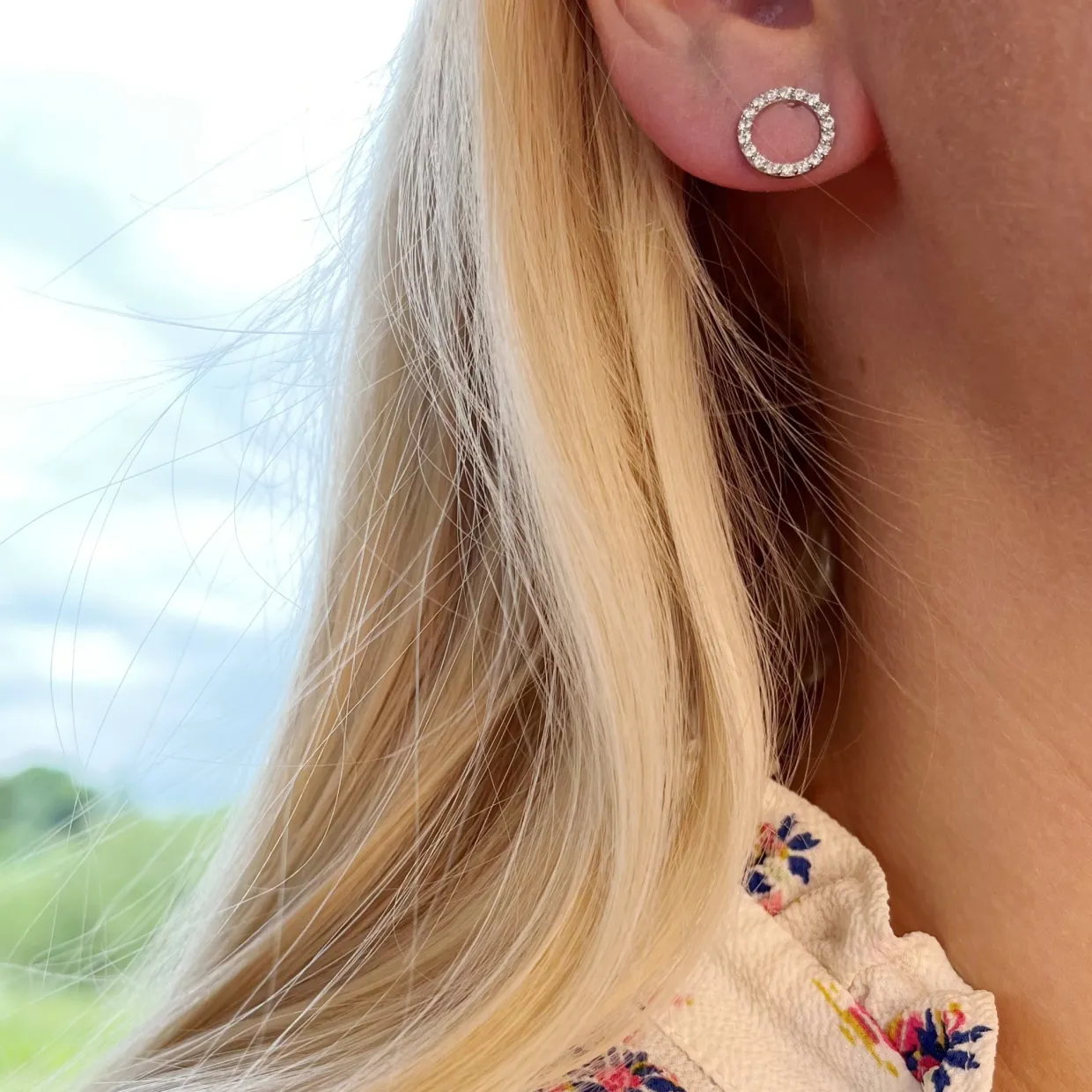 Sølv øreringe på stik med cirkel. I cirklen sidder der syntetiske zirkonia hele vejen rundt. Til øreringene er der også både halskæde og ring til.