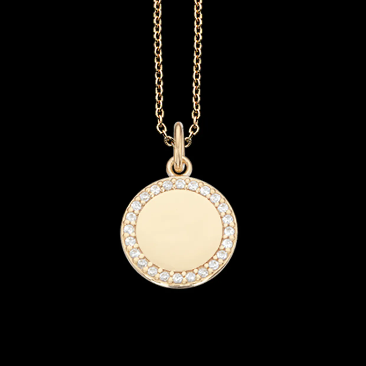Super flot halskæde i rosa forgyldt sølv med rundt vedhæng som er omkranset med syntetiske zikonia som giver kæden et utrolig flot look