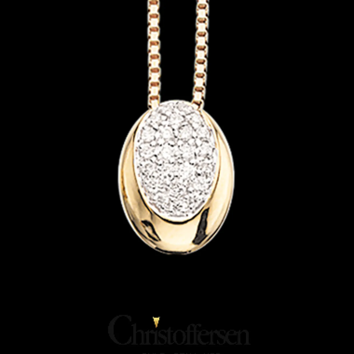 14 karat guld vedhæng med brillanter på i alt 0,17 carat wesselton/si. Vedhænget er ovalt og de pavé fattet brillanter sidder i en hvidgulds fatning. Kæden er en sølv forgyldt venezia kæde.