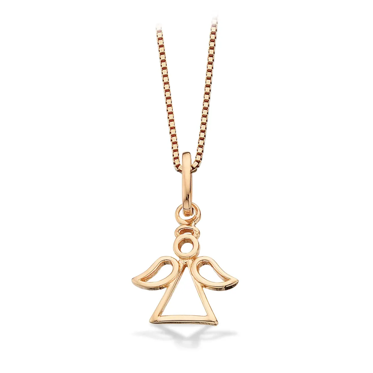 Dette fine vedhæng er fremstillet i 8 karat rød guld og er blank i overfladen. Vedhænget er designet som en engel som måler 11 x 11 mm. Til vedhænget følger en sølv forgyldt kæde som måler 42+3 cm.