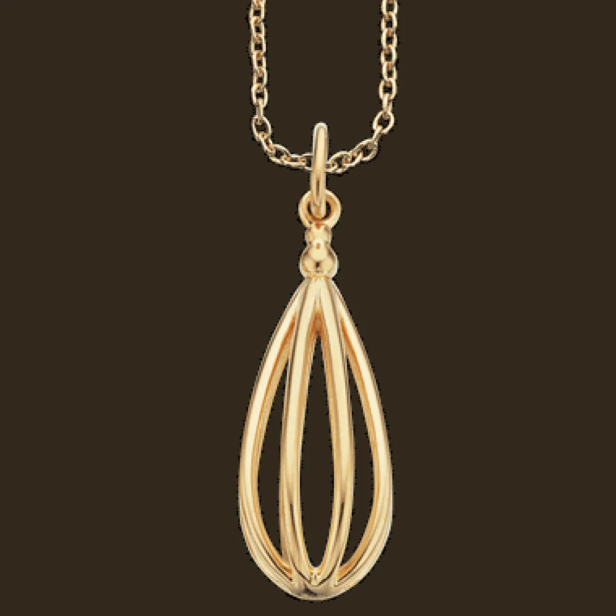 Dette fine vedhæng er fremstillet i guldbelagt sterling sølv. Vedhænget er designet som en åben dråbe. Til vedhænget følger en sølv forgyldt kæde på 45 cm.