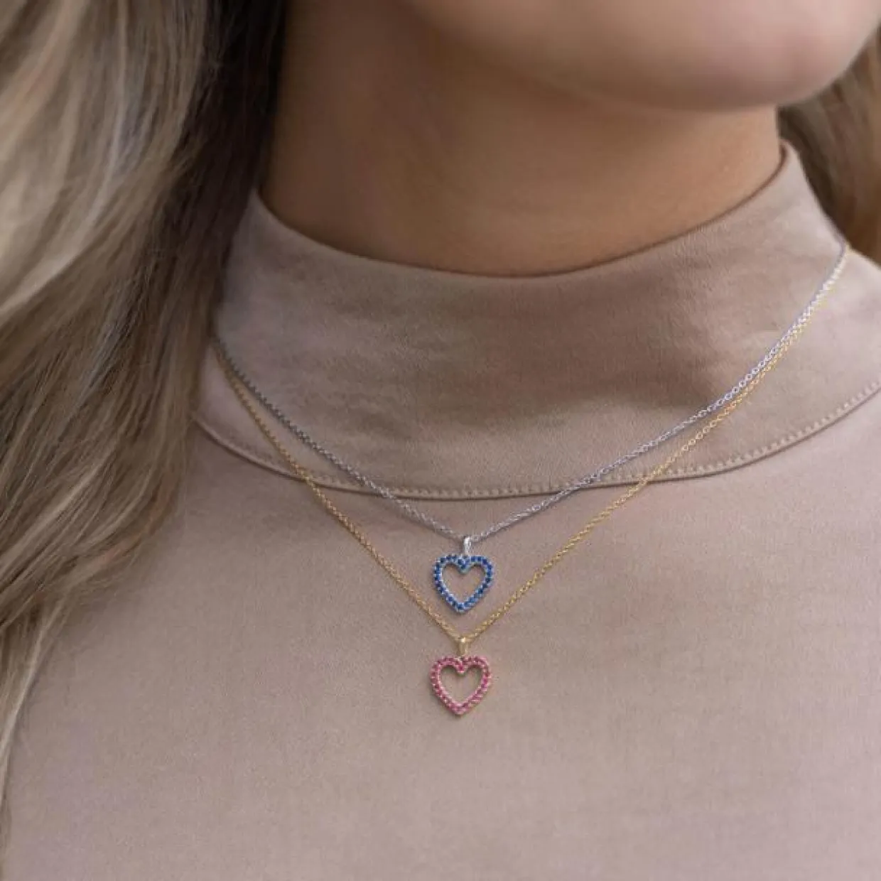 14 karat guld vedhæng hjerte med rubiner hele vejen rundt. Til vedhænget medfølger en sølv forgyldt rund anker kæde i 45 cm, som kan ombyttes efterfølgende.