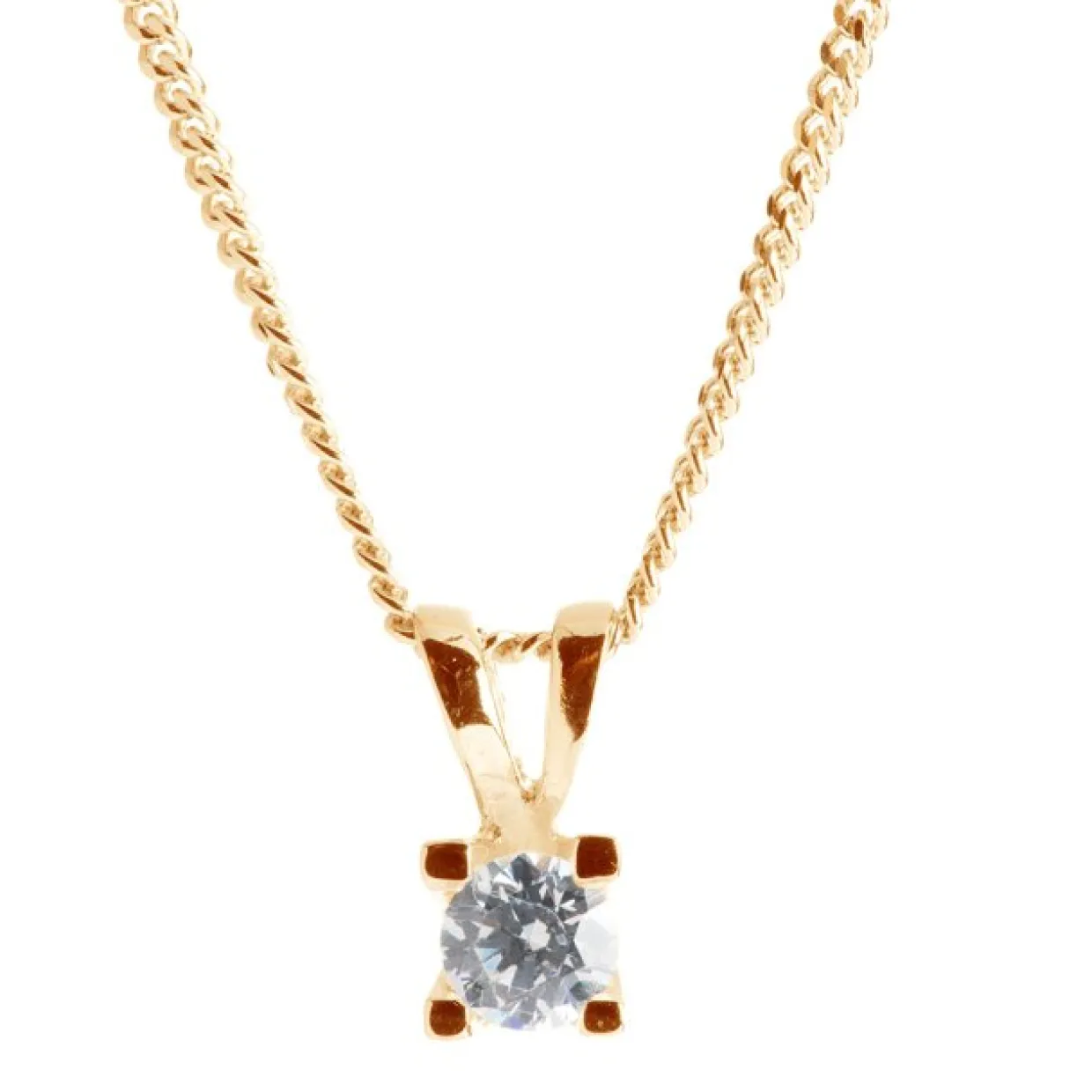 Dette simple vedhæng er fremstillet i sterling sølv, og forgyldt med 14 karat rød guld. Vedhænget har en kubisk zirkon i en grabbefatning. Til vedhænget følger en sølv forgyldt kæde med.