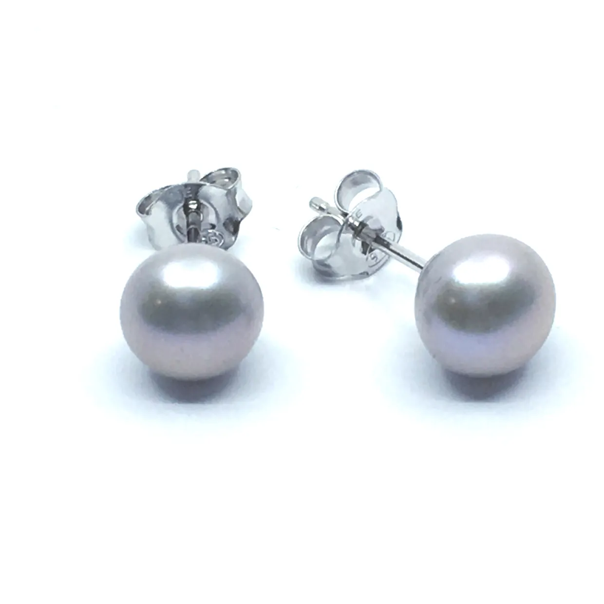 SØLV ØRESTIK RHODINERET MED KNAP LYS GRÅ FARVET FERSKVANDSPERLE 5 MM