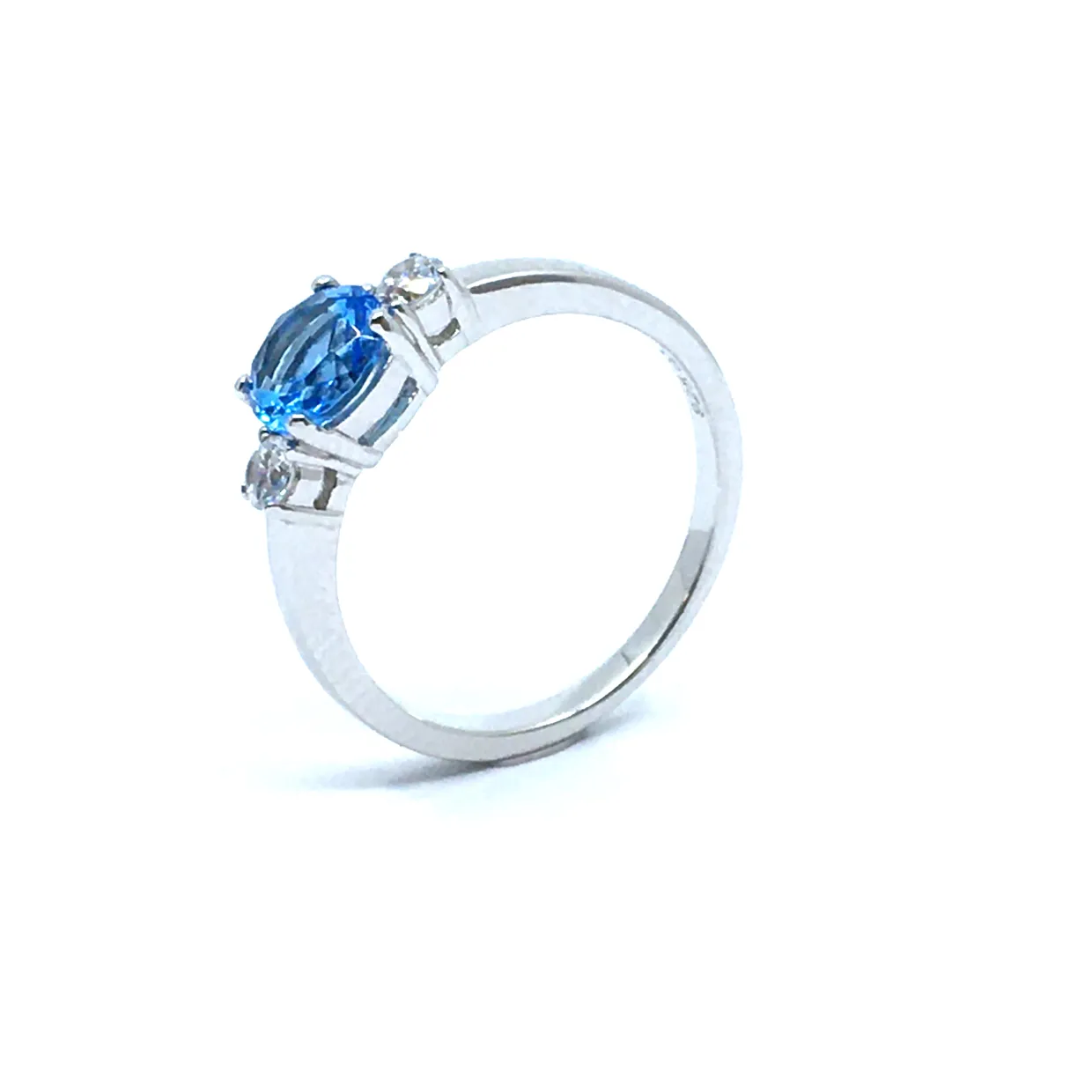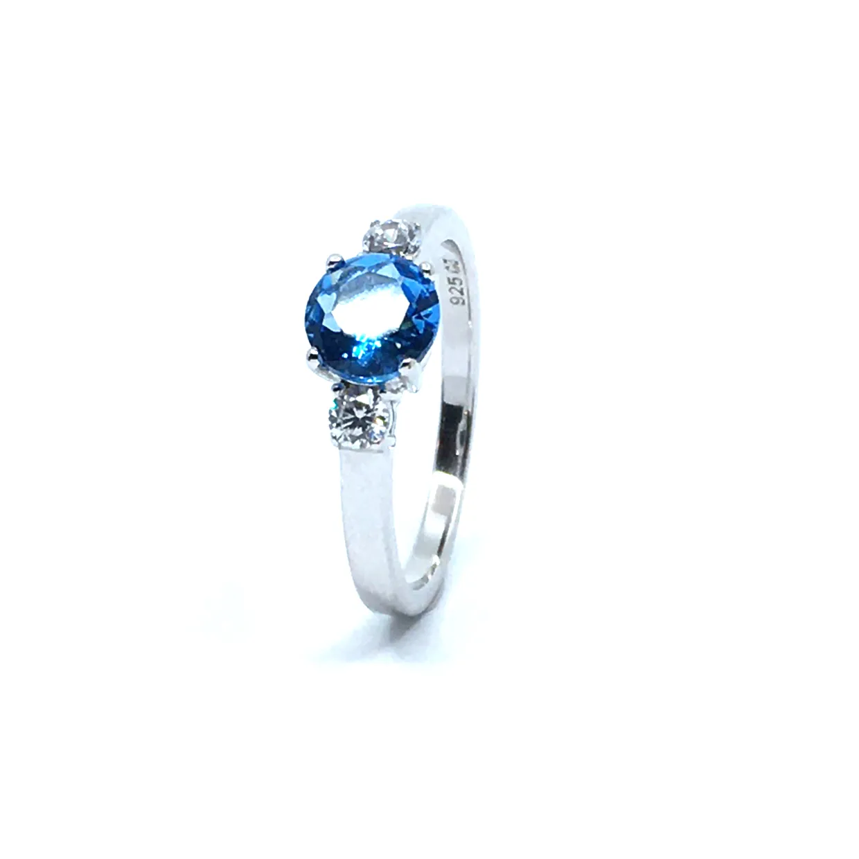 SØLV RING RHODINERET MED SYNTETISK LYSE BLÅ AQUAMARIN OG ZIRKONIA