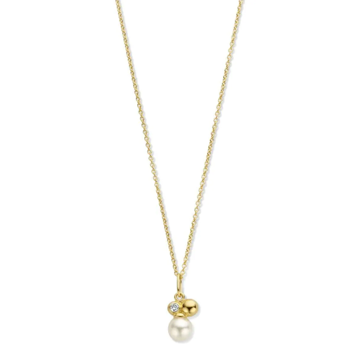 Halskæden er lavet i 14 karats guld med 14 karats guld vedhæng med hvide ferskvands perle en brillant 0,02 WVS og en guld kugle siddende sammen.