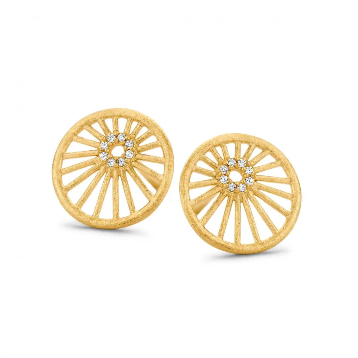 Fine ørestikker fra Spirit Icons, med et fint design, hvor glimmer møder en rustik overflade. Øreringen er lavet i sterling sølv med en forgyldt overflade. I midten af ørestikkerne sidder der små zirkonia sten, som skaber et elegant udtryk.
