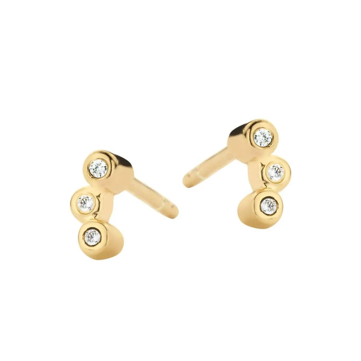 Disse fine Bliss øreringe er udformet med en blankpoleret overflade i forgyldt sterlingsølv. Ørestikkerne er designet med tre små zirkonia, hvilket giver et enkelt udtryk.