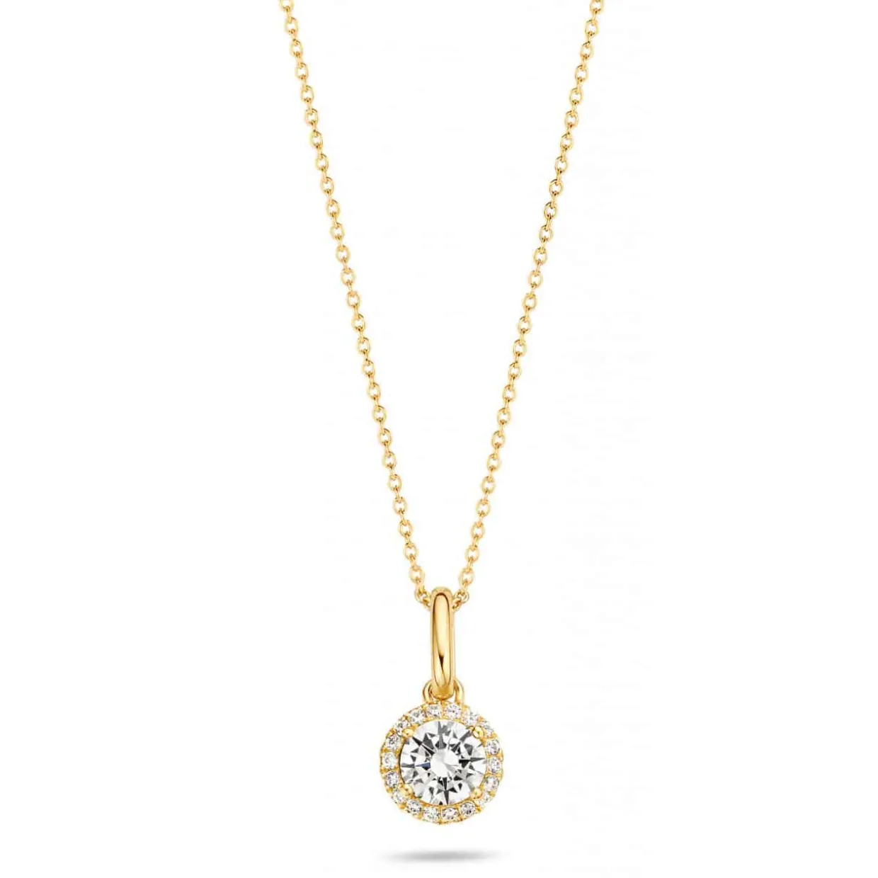 Smuk og elegant halskæde, som vil passe til hver en anledning. Halskæden er lavet ud af sterling sølv som er blevet guld belagt, og har en masse små syntetiske zirkoniaer rundt i kanten, samt en stor syntetisk zirkonia i midten.