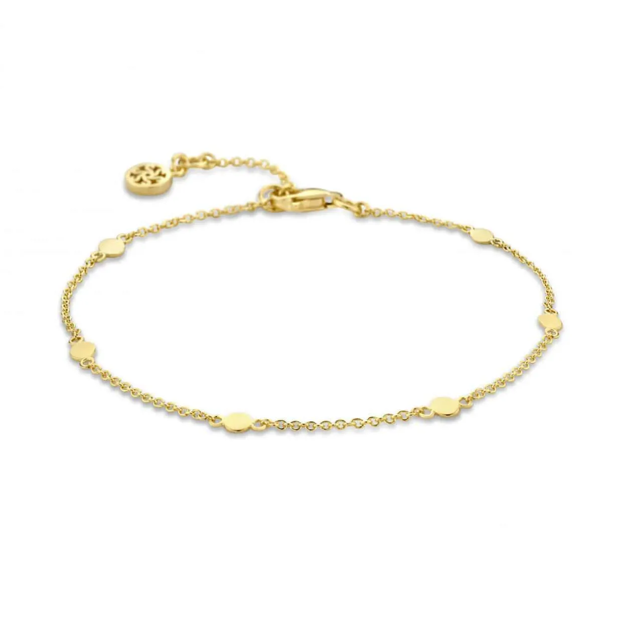 Enkelt forgyldt armbånd fra Sprit Icons. Armbåndet har detaljer af 5 små runde sølv plader, der sidder rundt om armbåndet.