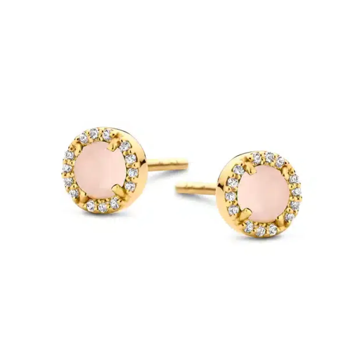 Øreringen er fremstillet i 18 karats forgyldt sterling sølv, ørestikken er formet som en cirkel, med en lyserød zirkon i midten og med klare små zirkoner rundt om.