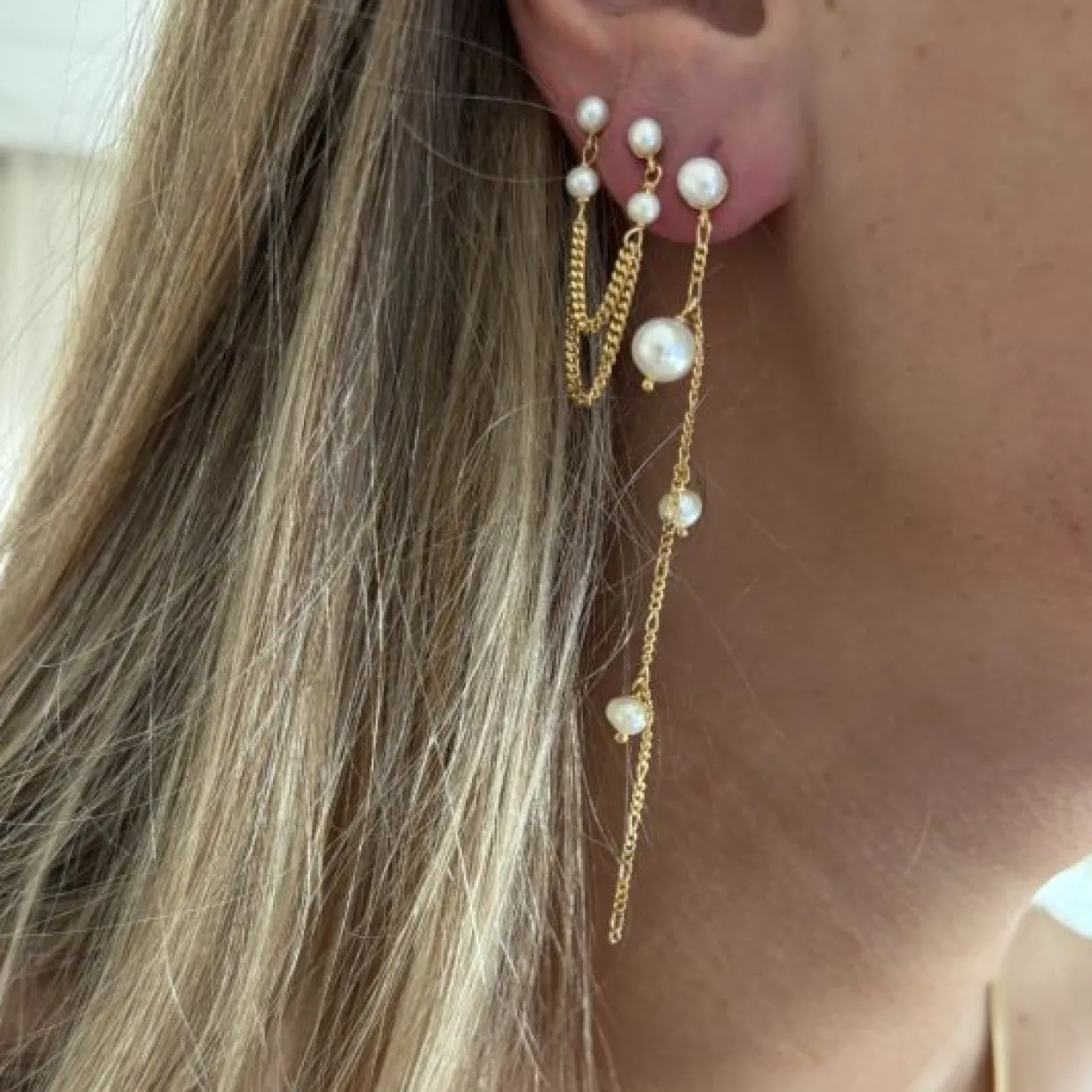 Smuk sølv forgyldt ørering med lang kæde, beklædt med flere størrelser perler.